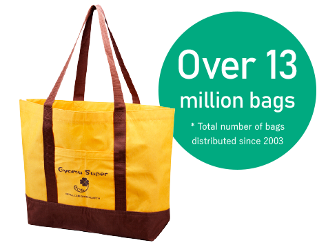We created Gyomu Super’s original eco-bags (reusable bags) in response to global warming and the plastic waste problem. Since around 2003, we have distributed more than 13 million bags for free mainly when a new Gyomu Super store opens.